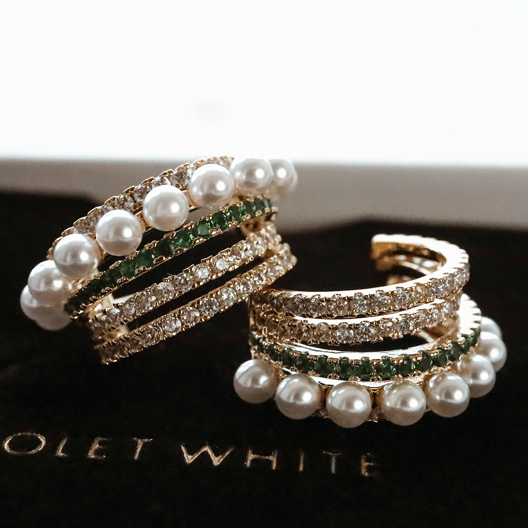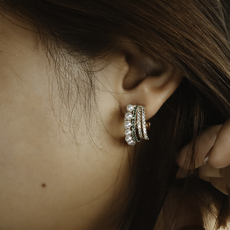 Erica 純銀14K金環繞耳環- 獨特的三環式設計,交錯鑲坎珍珠與多彩鋯石,豐富耳邊線條,具有存在感的設計,恰到好處的尺寸亦不會過於誇張。