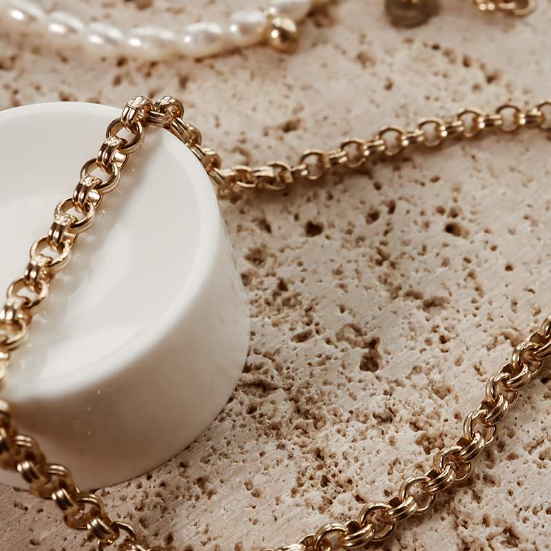 Hera 14K包金項鍊鎖骨鏈- 14KGF 材質含 5% 固態黃金,如同14K金材質可直接洗澡碰水,不會褪色,不用太費心照顧。帶有大量細節的圈鍊串接而成,造型感滿分。非常適合疊戴細緻的寶石項鍊,單戴搭配白T、牛仔褲,也個性十足。