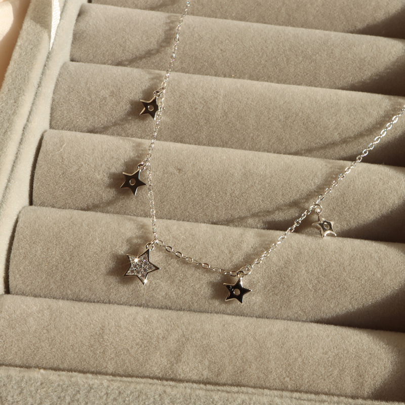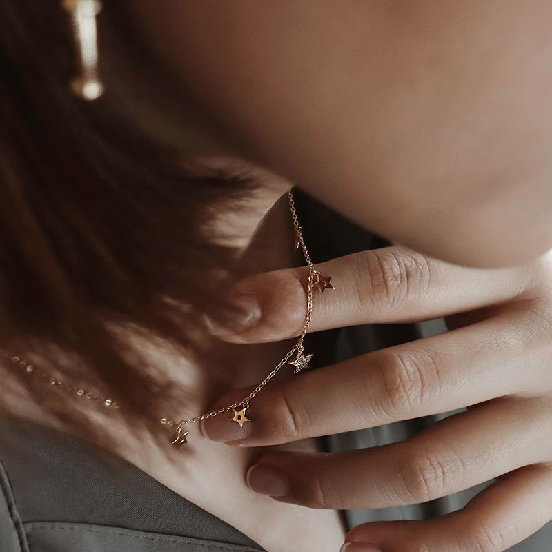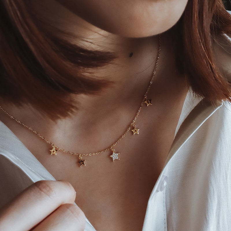 Clasp 鎖扣類型: 彈簧 C 圈 DESCRIPTION 這款設計的靈感源自非常喜歡星空、喜歡旅行的人,在大自然的夜晚中抬頭看見的點點繁星。這條項鍊採用S925純銀,浸入14K金厚鍍保色 ,配有閃亮的白鋯石和星星墜飾,運用1 大4 小不同尺寸的星星打造彷如星空般的層次光亮。將這條項鍊與其他簡約長鍊搭配佩戴,營造出和諧的外觀。